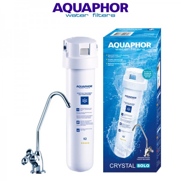 Σύστημα φίλτρανσης Aquaphor Crystal Solo με ενεργό άνθρακα, που τοποθετείται κάτω από τον πάγκο του νεροχύτη και έχει ανεξάρτητο βρυσάκι για το καθαρό νερό. Δυνατό φίλτρο νερού κάτω πάγκου με μικρές διαστάσεις για να χωράει παντού. Περιλαμβάνει το πρώτο ανταλλακτικό χρήσης.