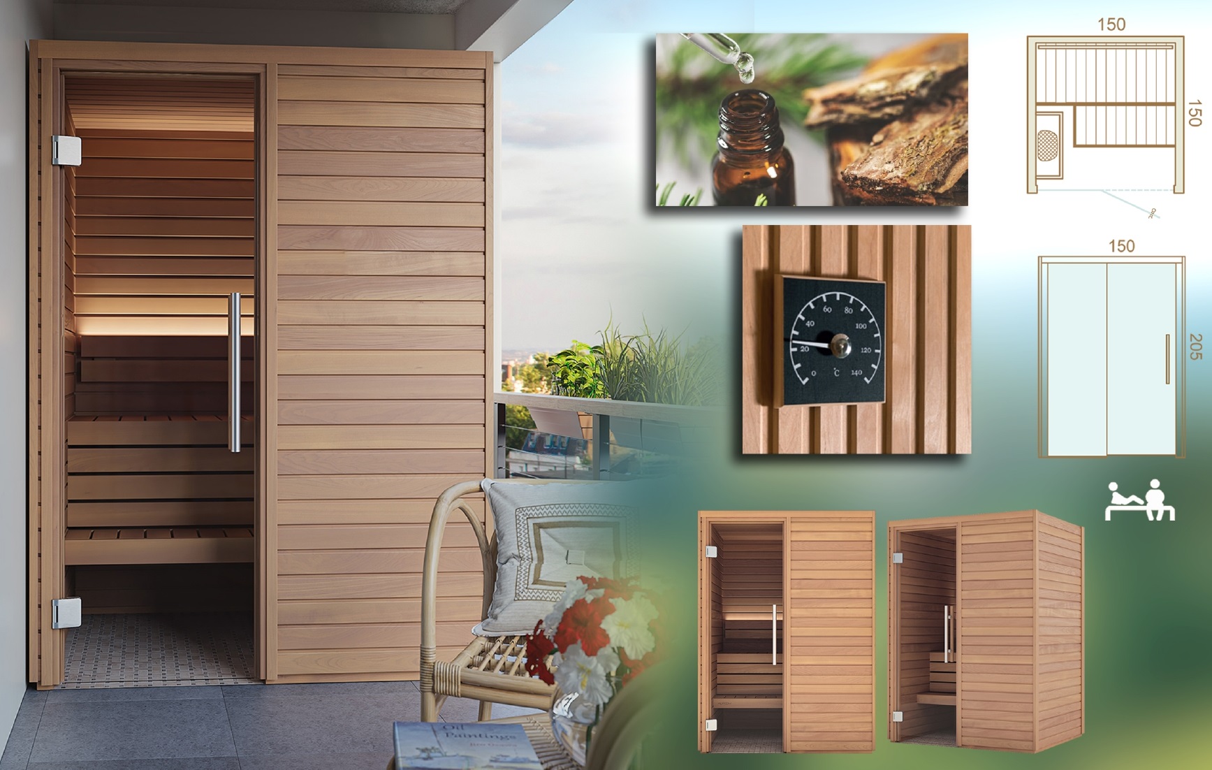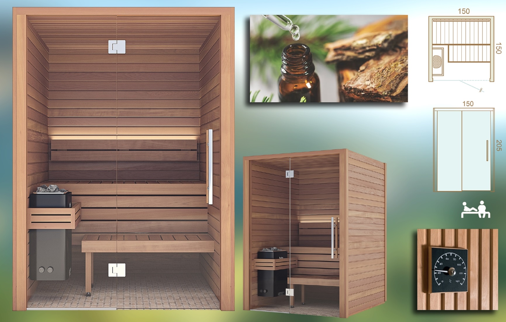 Κατασκευασμένη εξωτερικά από ξυλεία μηδενικής ρητίνης, μεγαλωμένη αργά κάτω από εξαιρετικά αντίξοες κλιματικές συνθήκες ώστε να αποκτήσει την μέγιστη δυνατή πυκνότητα, και εσωτερικά επενδύεται με το δημοφιλές “Aspen”, ένα καθαρό ελαφρύ ξύλο -με χαρακτηριστική αλλά ταυτόχρονα εκλεπτυσμένη οσμή- ιδανικό για τη διαμόρφωση πάγκων. Προσφέρει στον χρήστη την χαλάρωση που ονειρεύεται, μυϊκή ανακούφιση και καταστολή του άγχους που προκαλείται από τους έντονους ρυθμούς της καθημερινότητας.