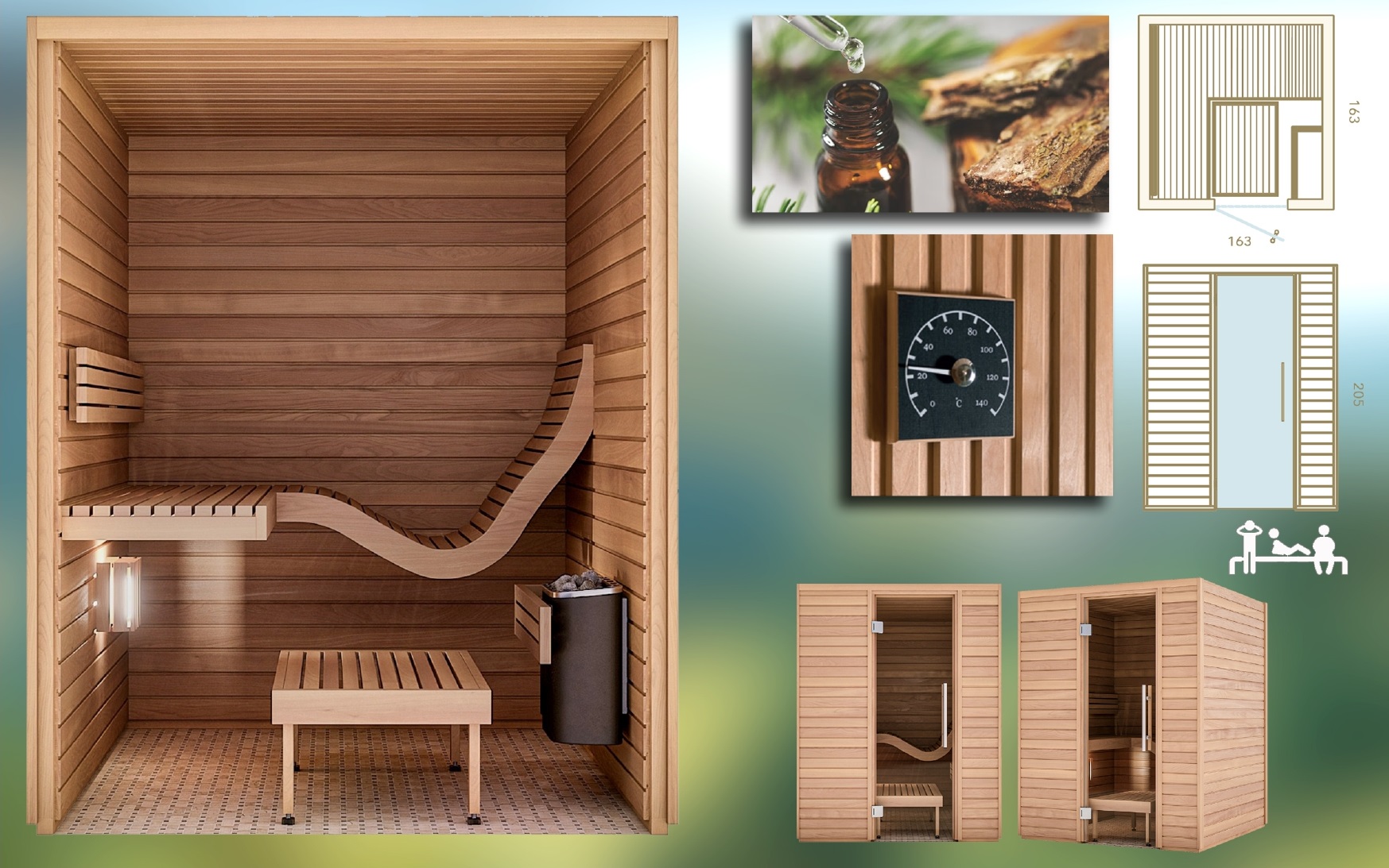 Κατασκευασμένη εξωτερικά από ξυλεία μηδενικής ρητίνης, μεγαλωμένη αργά κάτω από εξαιρετικά αντίξοες κλιματικές συνθήκες ώστε να αποκτήσει την μέγιστη δυνατή πυκνότητα, και εσωτερικά επενδύεται με το δημοφιλές “Aspen”, ένα καθαρό ελαφρύ ξύλο -με χαρακτηριστική αλλά ταυτόχρονα εκλεπτυσμένη οσμή- ιδανικό για τη διαμόρφωση πάγκων. Προσφέρει στον χρήστη την χαλάρωση που ονειρεύεται, μυϊκή ανακούφιση και καταστολή του άγχους που προκαλείται από τους έντονους ρυθμούς της καθημερινότητας.